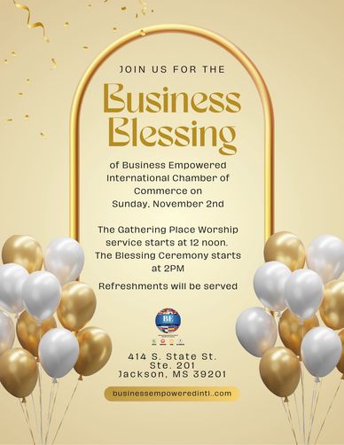 Join us for the official Business Blessing of the Business Empowered International Chamber of Commerce at our new office location in Jackson, MS. This special event includes a worship service hosted by The Gathering Place at 12 noon, followed by a powerful Blessing Ceremony at 2 PM, where family, friends, and leaders will speak words of faith, favor, and purpose over this Kingdom assignment. Refreshments will be served. All are welcome! Must RSVP at info@bemississippi.com.